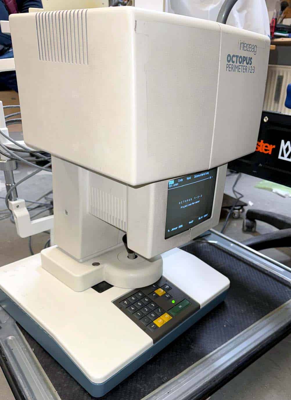 Good operating condition. Optimized for the central 30° visual field. Core programs: Standard diagnostic programs such as G1, M2, and 32. Examination strategies: Normal: Precise 4-2-1 dB exposure series. Dynamic: Time-optimized threshold determination. TOP (Tendency-Oriented Perimetry): Ultra-fast measurement strategy for maximum patient throughput.